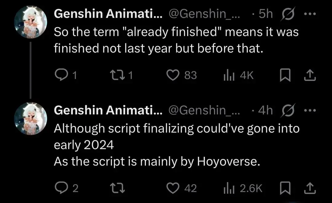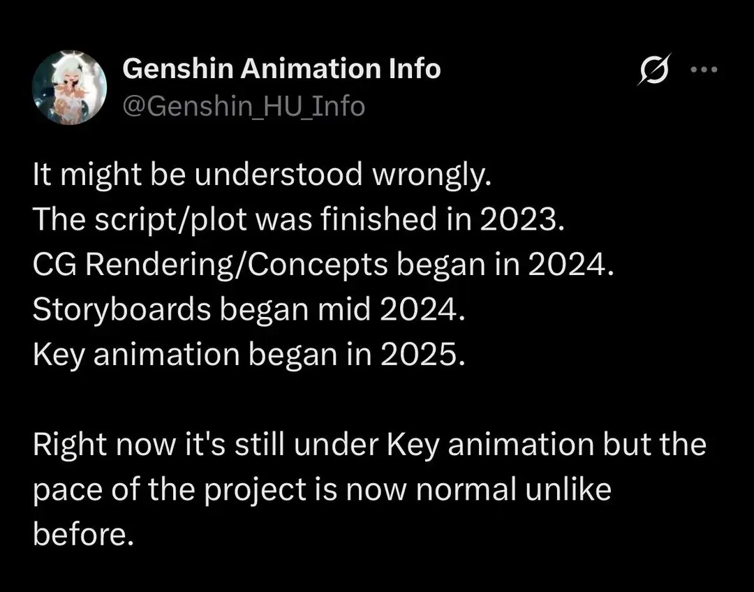 Дополнительные детали о стадии производства раскрыл источник Genshin_HU_Info. По его словам, раннюю формулировку «проект уже завершен» могли понять неправильно. Речь идет не о полной готовности аниме, а о завершении сценарной части. Скрипт и сюжет были закончены в 2023-2024 годах. Основной сценарий, как отмечается, создавался преимущественно силами HoYoverse.