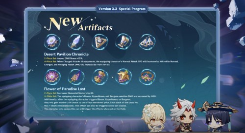 Добавлять новые области в этом патче разработчики не планируют, однако появилась информация о том, что они введут еще одно подземелье, где игроки смогут выбивать два дополнительных комплекта артефактов: Хроники Чертогов в пустыне повышают Анемо урон, а также повреждения и скорость обычных атак, а Цветок потерянного рая – увеличивает повреждения от реакции Бутонизация и его производных, а также повышает мастерство стихий.