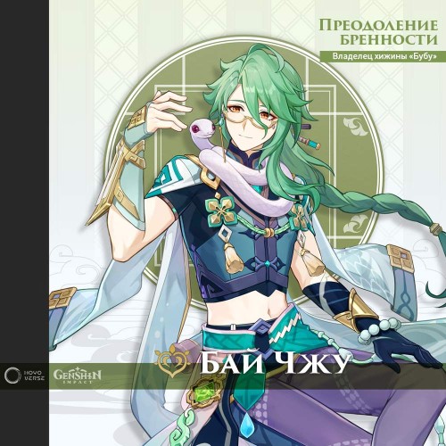 - Бай Чжу (5 звезд) – обладатель Дендро глаза бога, который в битвах использует катализатор. С помощью своих способностей он может лечить союзников и накладывать на них щит, поэтому в бою он в основном играет роль саппорта.