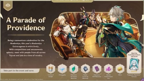 Основной ивент патча 3.6, посвященный сумерской академии. Его сюжетная линия позволит повстречать немало старых знакомых, включая Нилу, Странника, Кандакию, Коллеи, аль-Хайтама и Дэхью. Вам предстоит поучаствовать в ряде экспериментов, подготовленных разными даршанами. В награду за прохождение испытаний вы сможете получить 4-звездочного персонажа Фарузан.