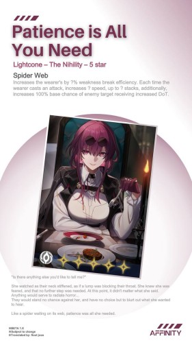 - Просто надо подождать (5 звезд; Небытие; сила атаки: 582, защита: 463, HP: 1058) – увеличивает урон на 24%. Каждый удар персонажа будет увеличивать его скорость на 4,8%. Бонус суммируется до трех раз. Накладывает статус Паутинка (Шок), который в начале хода наносит периодические электрические повреждения в размере 48% от силы атаки героя.