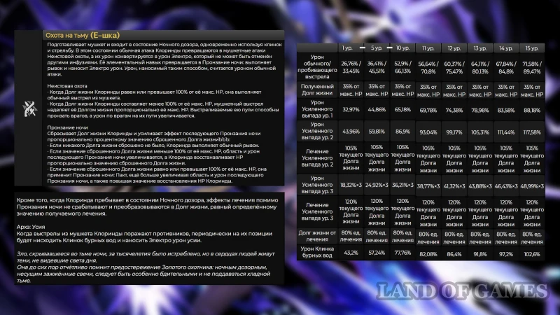 - Во время Е-шки встает в стойку и поглощает запас Долга жизни, от уровня которого зависит получаемое преимущество. В стойке Клоринда производит выпады вперед, которые можно использовать вместо спринта, при этом не тратя стамину;
