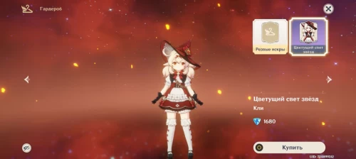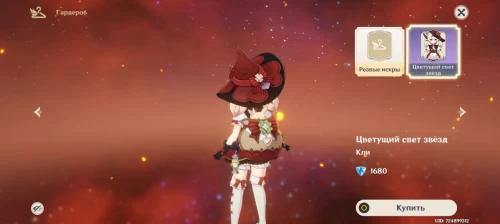 Наряд в стиле ведьмы для Кли, который она получила в подарок на одном из летних ивентов: большая шляпа, чулки с бантиками и рюкзак через плечо. Костюм выполнен в бордовых оттенках.