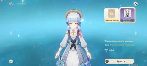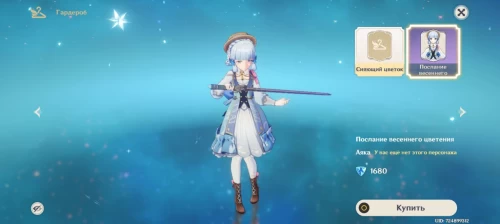 Легкий наряд для Аяки: соломенная шляпка, нежно-голубое платье с фиолетовыми оттенками и сапожки. Скин был добавлен в версии 3.4.
