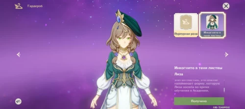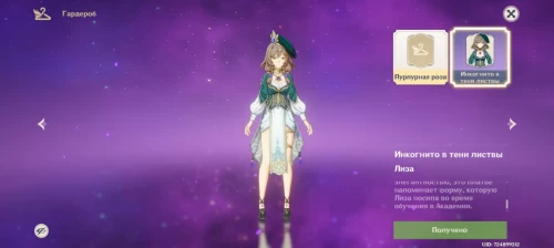 Костюм Лизы, напоминающий форму учеников Академии Сумеру. Выполнен в зеленых и белых цветах с фиолетовыми украшениями. Скин появился и раздавался бесплатно в версии 3.4, в ивенте «Второе цветение».