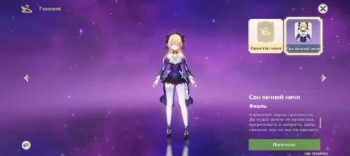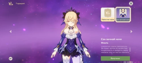 Парадный наряд Фишль. Как и обычный ее костюм, выполнен в готическом стиле, в темно-фиолетовых оттенках. Главным украшением является корона с двумя бантиками.