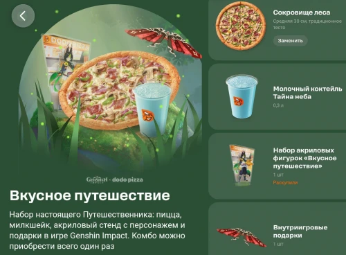 Genshin Impact и Додо Пицца проводят масштабную коллаборацию «Вкусное путешествие», в рамках которой игроки, купившие особую продукцию пиццерии, получат официальный мерч и внутриигровые подарки. В этой статье мы разберем подробности акции и расскажем, какие именно награды смогут получить Путешественники.