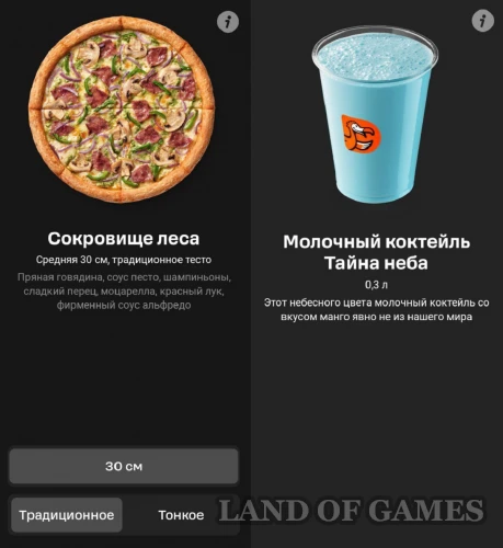 Комбо «Вкусное путешествие» состоит из пиццы «Сокровище леса» и молочного коктейля «Тайна неба». Каждый из продуктов можно заказать и отдельно.