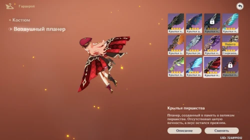 - Крылья пиршества — воздушный планер, можно надеть в меню персонажа, во вкладке «Гардероб»