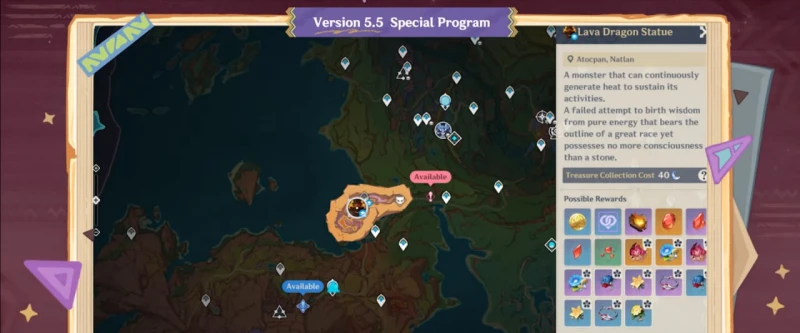 По ранней информации от инсайдеров мы уже знаем, что в версии 5.5 появится новая область. Но благодаря сливу от Kazusa мы также можем взглянуть на ее карту и узнать название двух основных локаций - Атокпан и Древняя Священная гора. Это место уже упоминалось в ранних утечках благодаря вулкану и племени Удел благодатных земель, которое здесь обитает. Всего в этой области будет порядка 16 телепортов и 1 Статуя семи Архонтов.