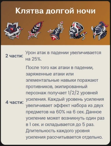 - Клятва долгой ночи – предназначен для персонажей, наносящих основной урон атаками в падении.