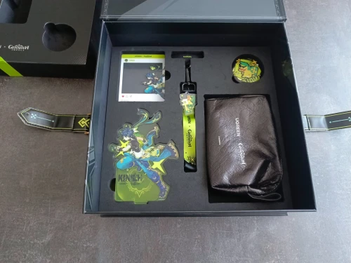 Первым делом отметим, что сам бокс и его содержимое выполнено в уникальном дизайне с элементами, которые были вдохновлены Киничем, – легендарным персонажем Genshin Impact, который относится к Дендро стихии и владеет двуручным мечом. Он родом из Натлана и является умелым охотником на заврианов.