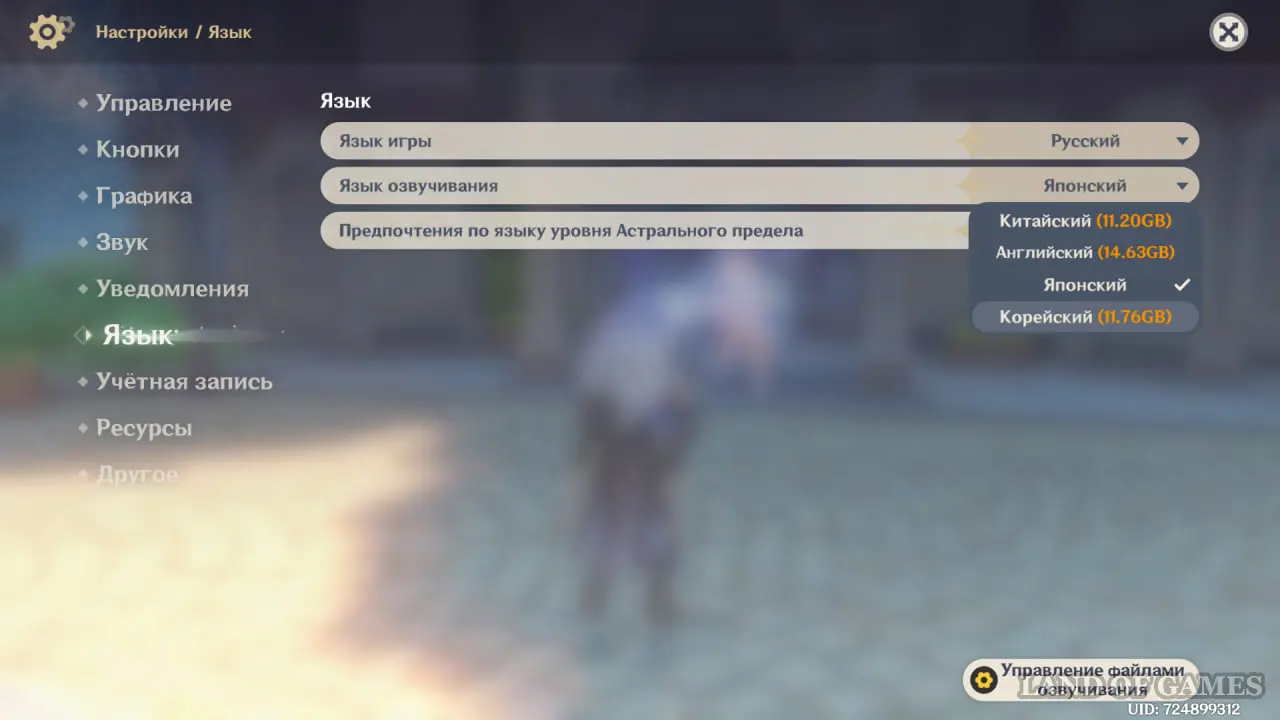 Самый «тяжелый» язык — японский (13.28 ГБ), самый «легкий» — китайский (11.2 ГБ), поэтому, если для вас не играет большой роли то, на каком языке общаются персонажи, выбирайте китайский. При установке нового языка старый не удаляется автоматически и продолжает занимать место. Чтобы удалить один из языков озвучки, в настройках выберите вкладку «Язык» и в правом нижнем углу перейдите в управление файлами озвучивания, выберите нужный вариант и удалите.
