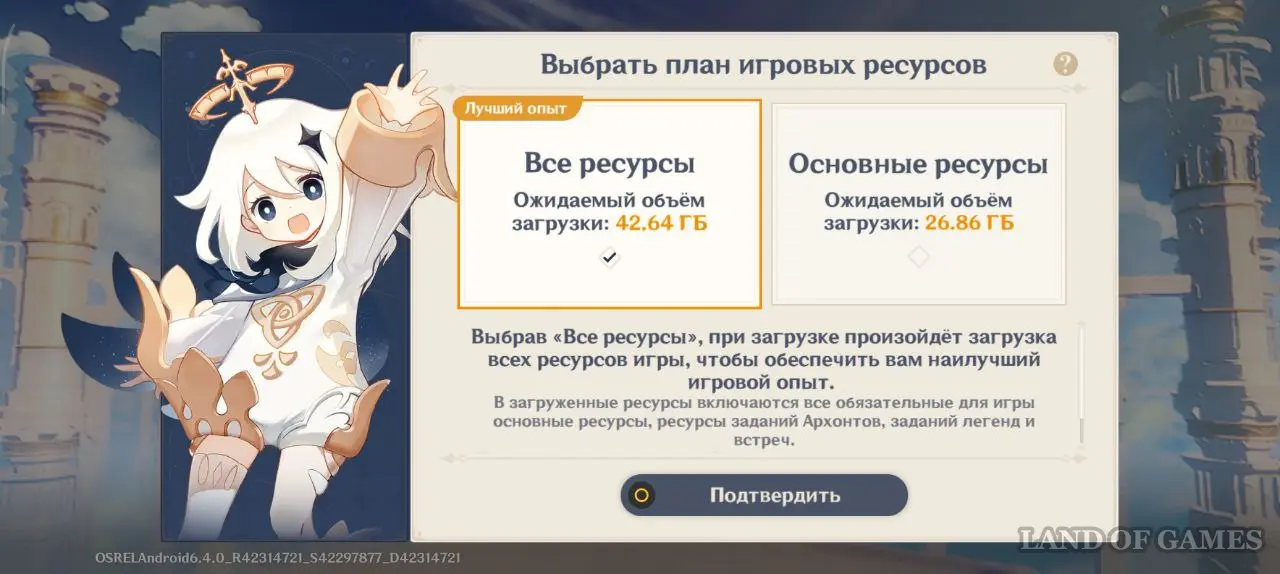 После загрузки лаунчера игра предлагает загрузить все данные (42.64 ГБ) или только основные ресурсы (26.86 ГБ).