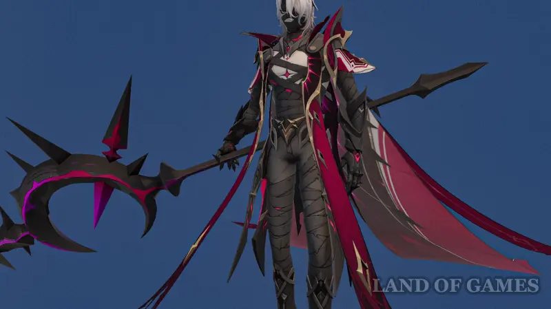 Поверх бинтов он носит черные декоративные доспехи с золотой отделкой, а на плечах — большой остроконечный багровый плащ, переходящий в более темный оттенок с золотыми и черными деталями, на передней части которого свисают два длинных полотнища. На нем темно-серые штаны, которые также частотно перетянуты бинтами, золотой пояс и высокие черные армированные сапоги с золотой подошвой.