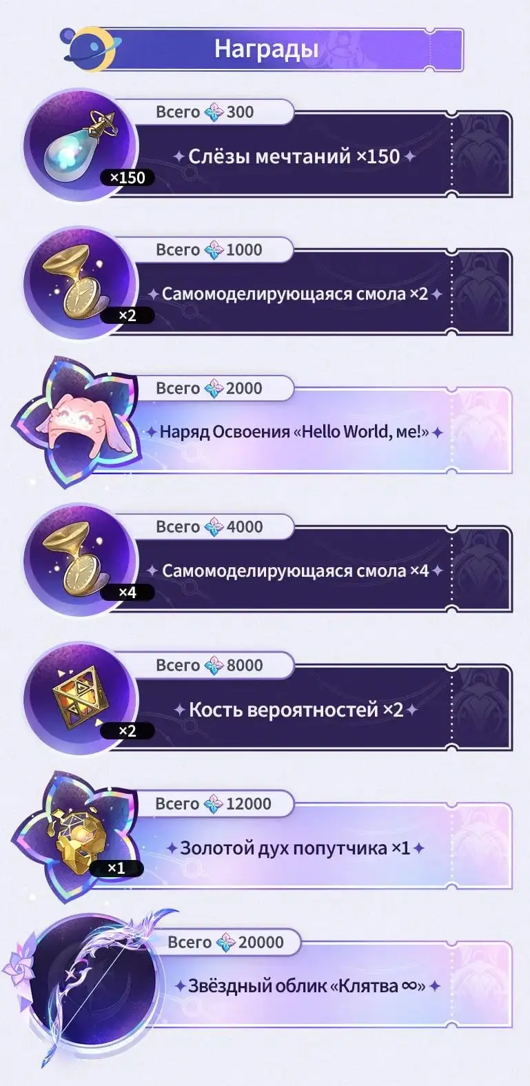 - Клятва бесконечности (лук Кирены) – меняет визуальные эффекты и анимации в бою. Главная награда донатного ивента