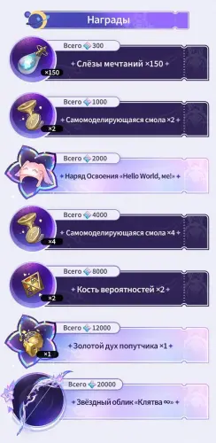 - Hello World, me! – головной убор в виде Мемо, прыгающий при ходьбе. Выдается за участие в ивенте «Заветные грезы» по покупке Сущностей древних снов