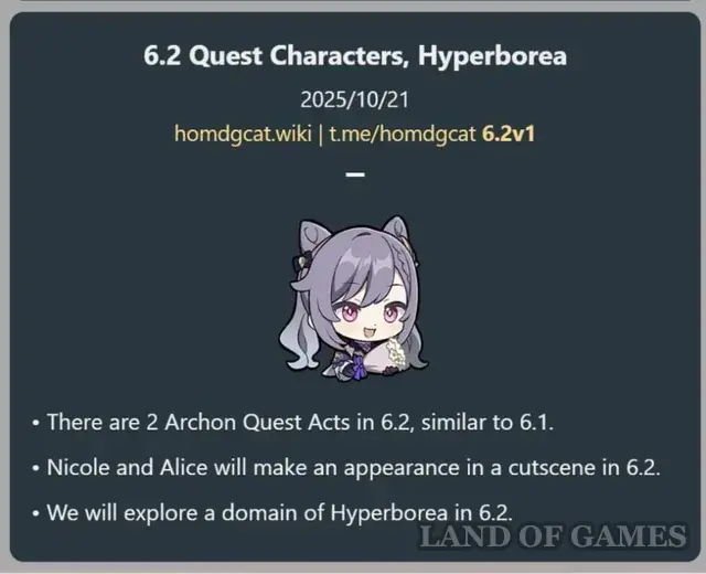 По данным инсайдера Dim, в следующем задании Архонтов 6.2 наконец появится Алиса – мать Кли и одна из самых загадочных фигур Мондштадта. Более того, в кат-сценах мы также услышим Барбелот (наставницу Моны) и Николь, что также подтвердили и HomDGCat. В том же сюжете появятся Дурин, Странник, а также Рейндоттир и Андерсдоттер, чьи имена неразрывно связаны с историей древних алхимических экспериментов и созданием Дурина.