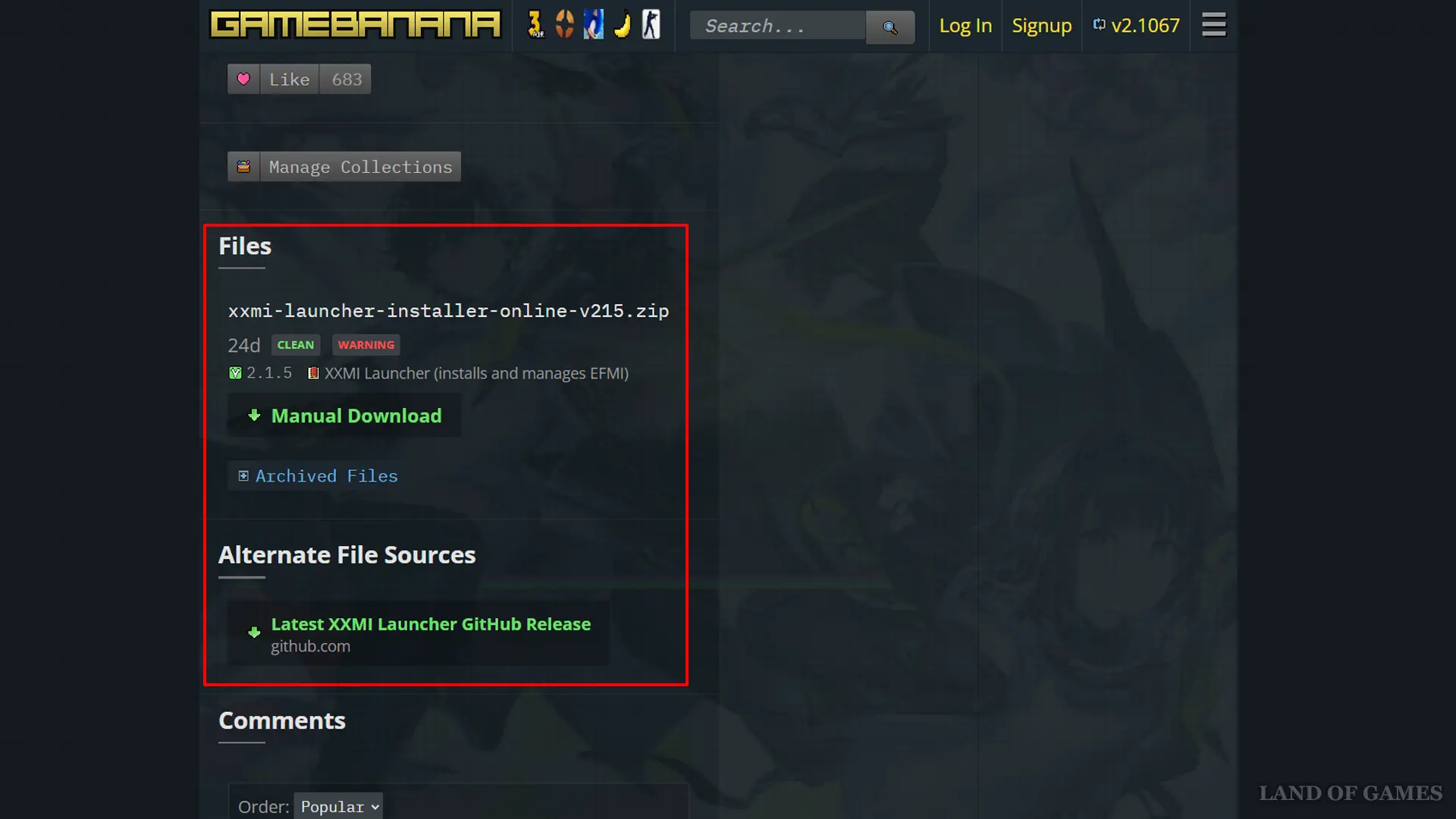 Перейдите на страницу скачивания EFMI (либо скачайте XXMI-Launcher с GitHub). Затем спуститесь до раздела Files → выберите Manual Download → Download (сверху всегда более актуальная версия).
