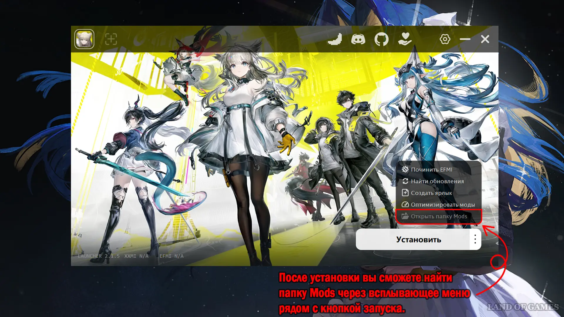 - Скачанные моды разархивируйте в папку Mods (ее можно найти, если нажать на три точки справа от кнопки запуска, либо открыв меню настроек и перейдя в раздел EFMI);