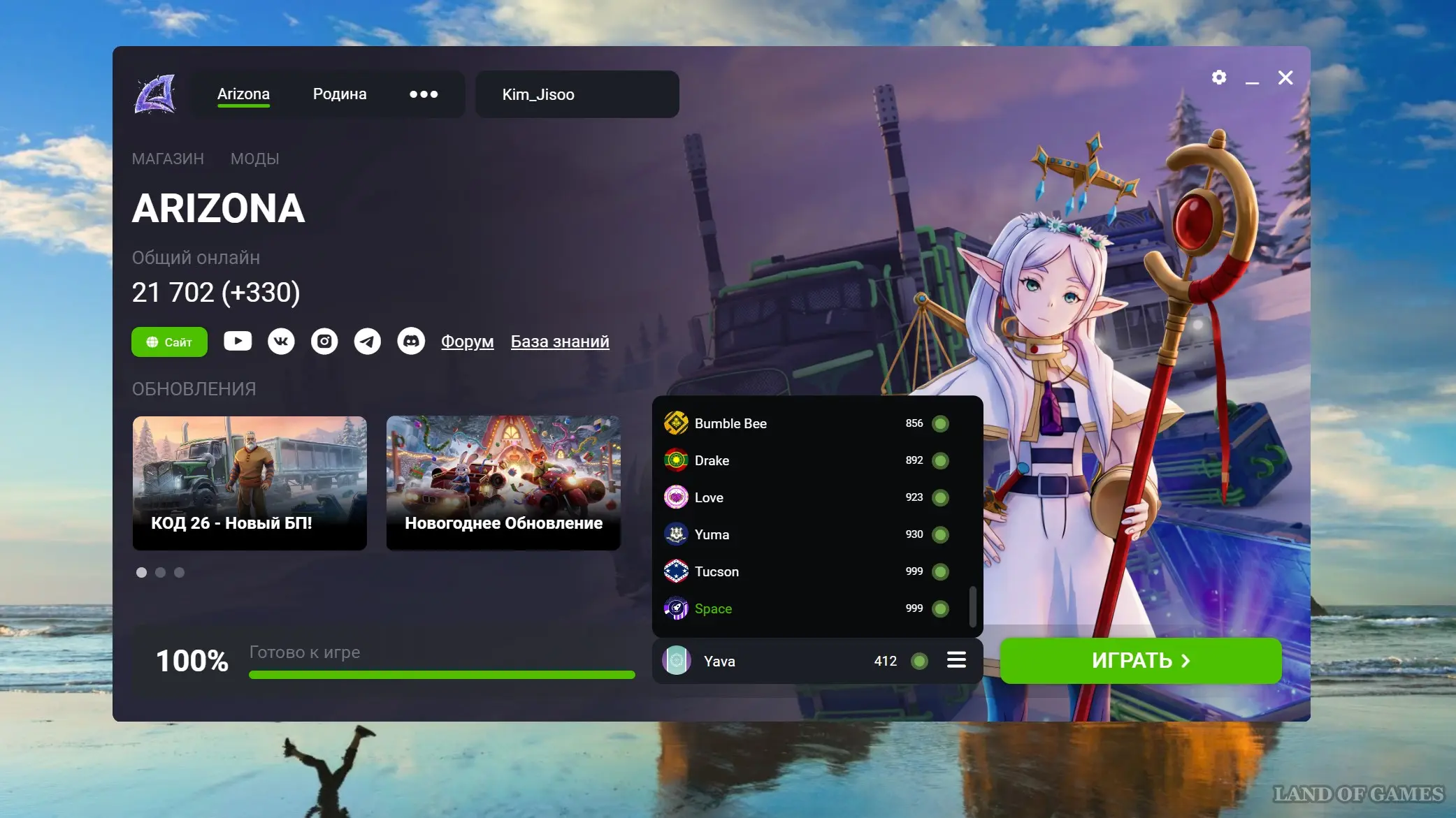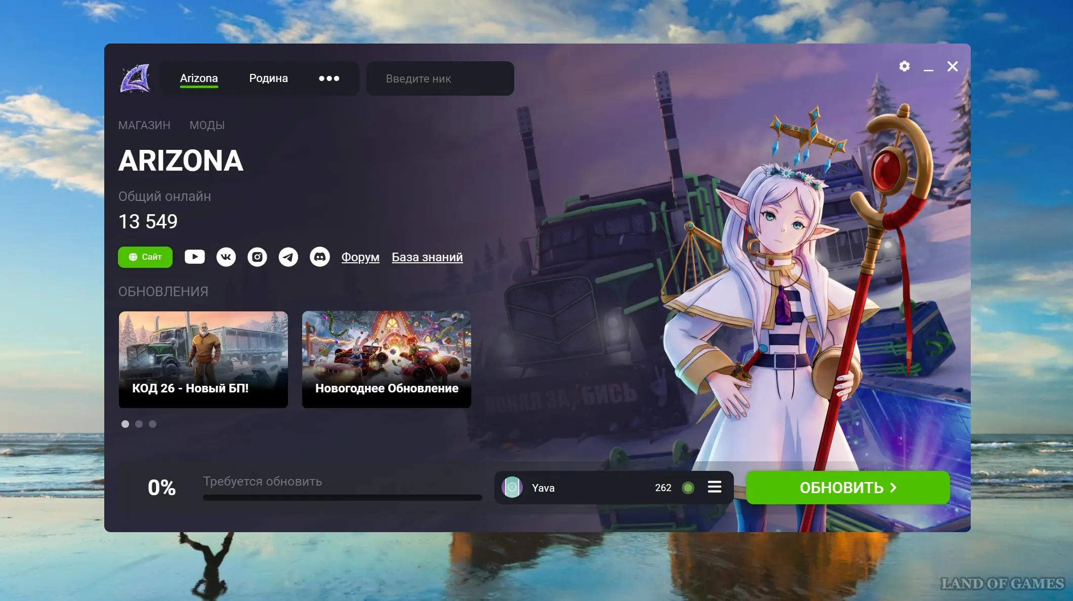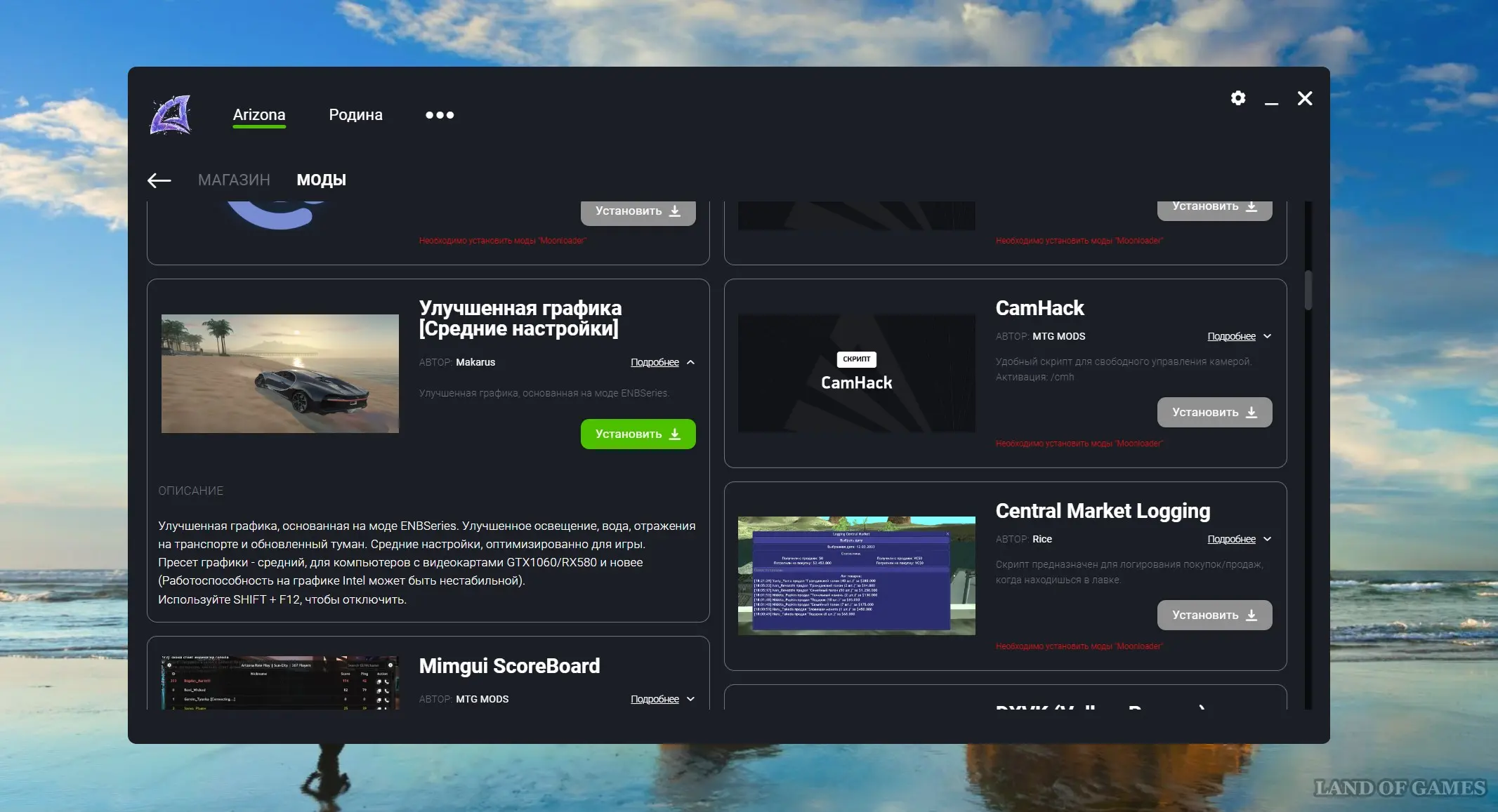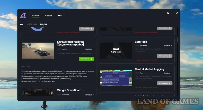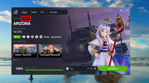 После установки лаунчера, запустите его, перейдите на вкладку «Arizona» в левом верхнем углу окошка и нажмите зеленую кнопку «Обновить» для скачивания всех необходимых файлов и папок. Когда процесс завершится, вы увидите внизу надпись «Играть», однако не спешите кликать на нее. Мы рекомендуем для начала заглянуть в раздел «Моды».