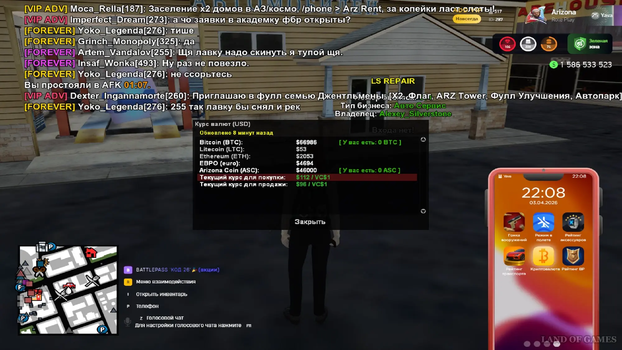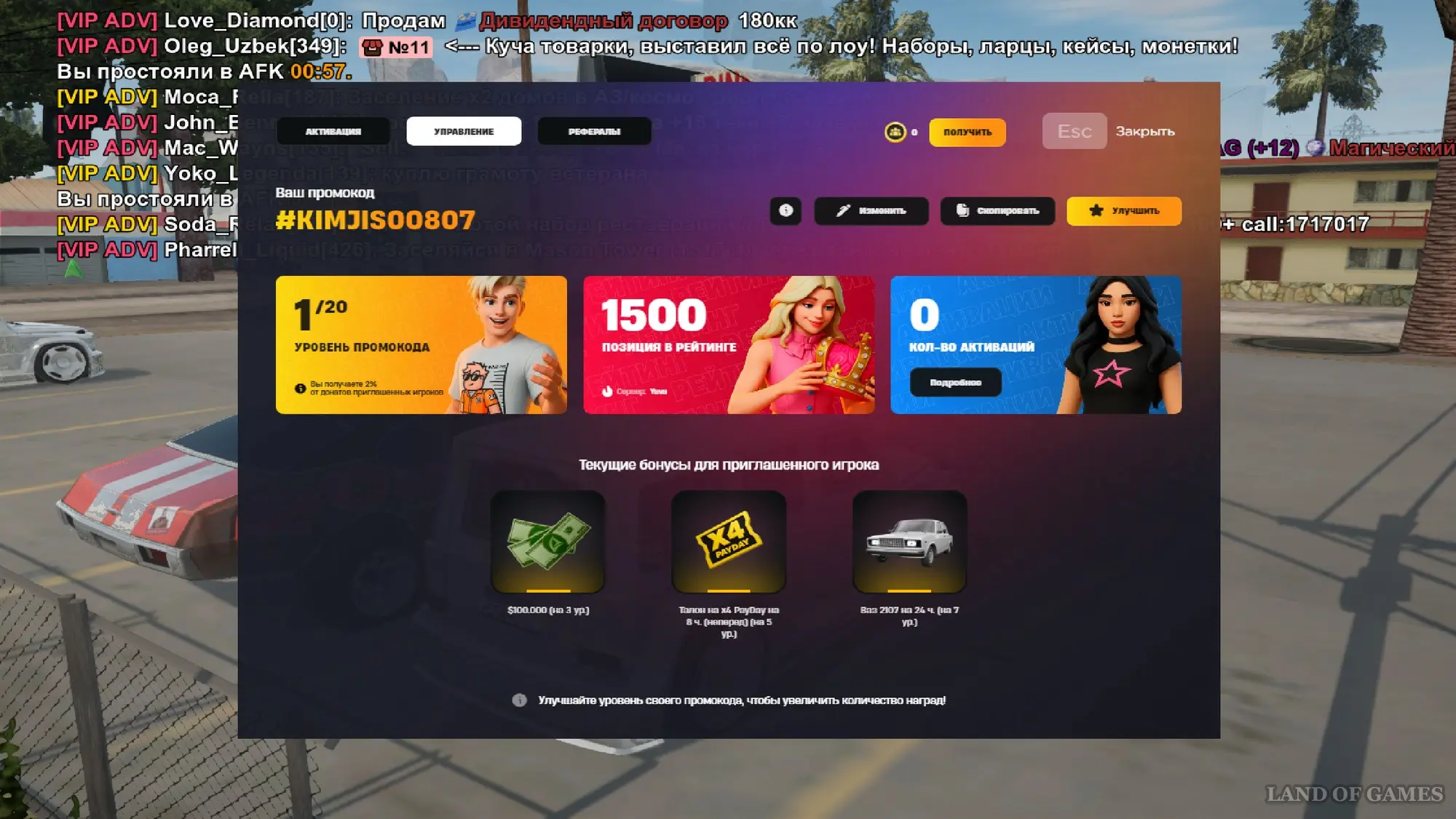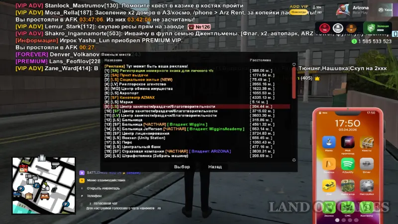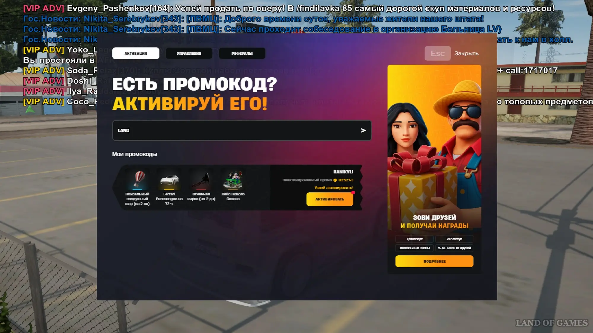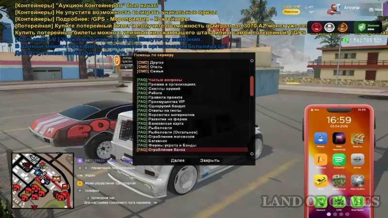 Еще на минутку отвлечем ваше внимание и укажем, что благодаря сотрудничеству с авторами Arizona RP нам удалось договориться о выдаче уникального промокода для всех читателей нашего портала. В меню телефона нажмите на кнопку «Мой промокод», а затем введите в текстовое поле слово LAND, чтобы получить в награду: