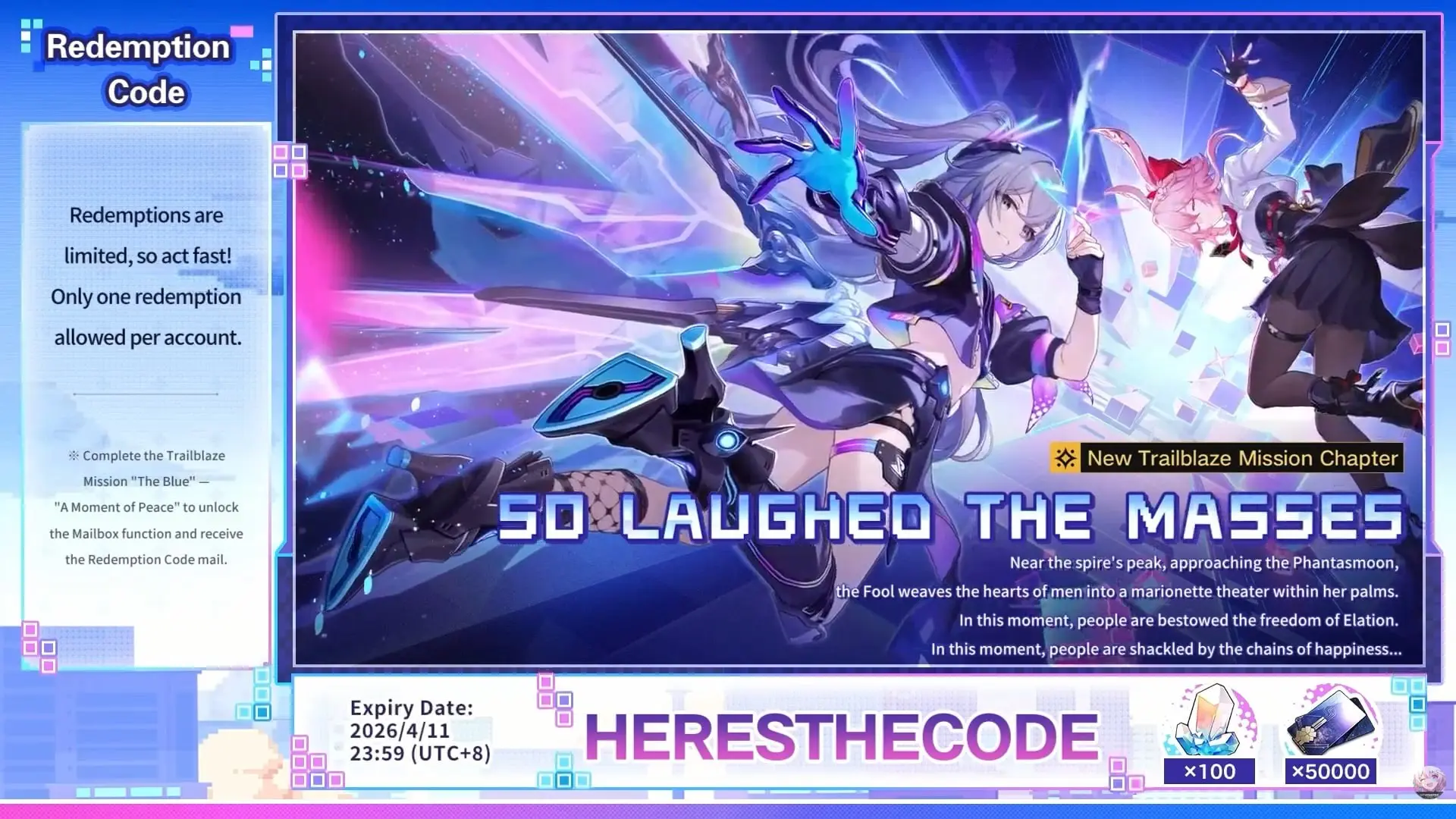 Коды работают до 11 апреля 18:59 (по МСК), поэтому лучше не откладывать и забрать награды заранее через игру или официальный сайт HSR.