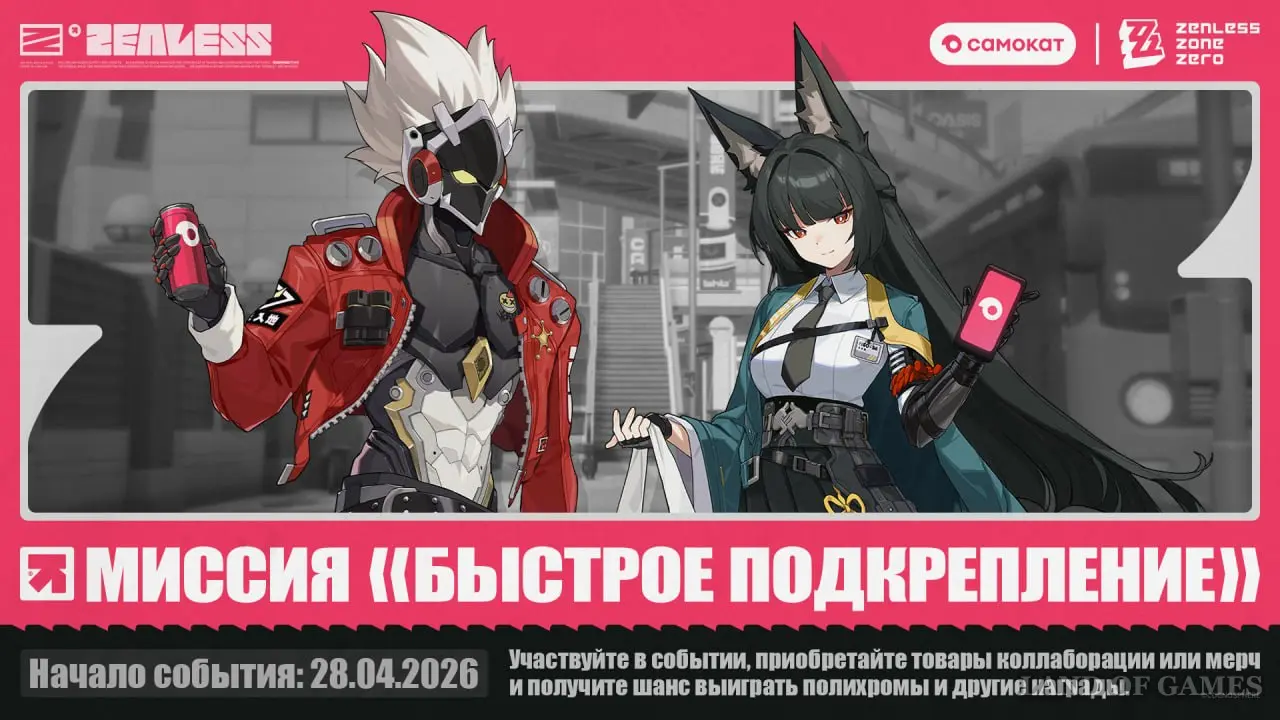Миссия «Быстрое подкрепление» — официальная коллаборация Zenless Zone Zero (ZZZ) и сервиса доставки Самокат. В ходе акции вы можете приобрести уникальные коллаборационные продукты и мерч, а также поучаствовать в розыгрыше призов и сыграть в мини-игры. В статье подробнее рассмотрим условия акции, сроки проведения и награды за участие.