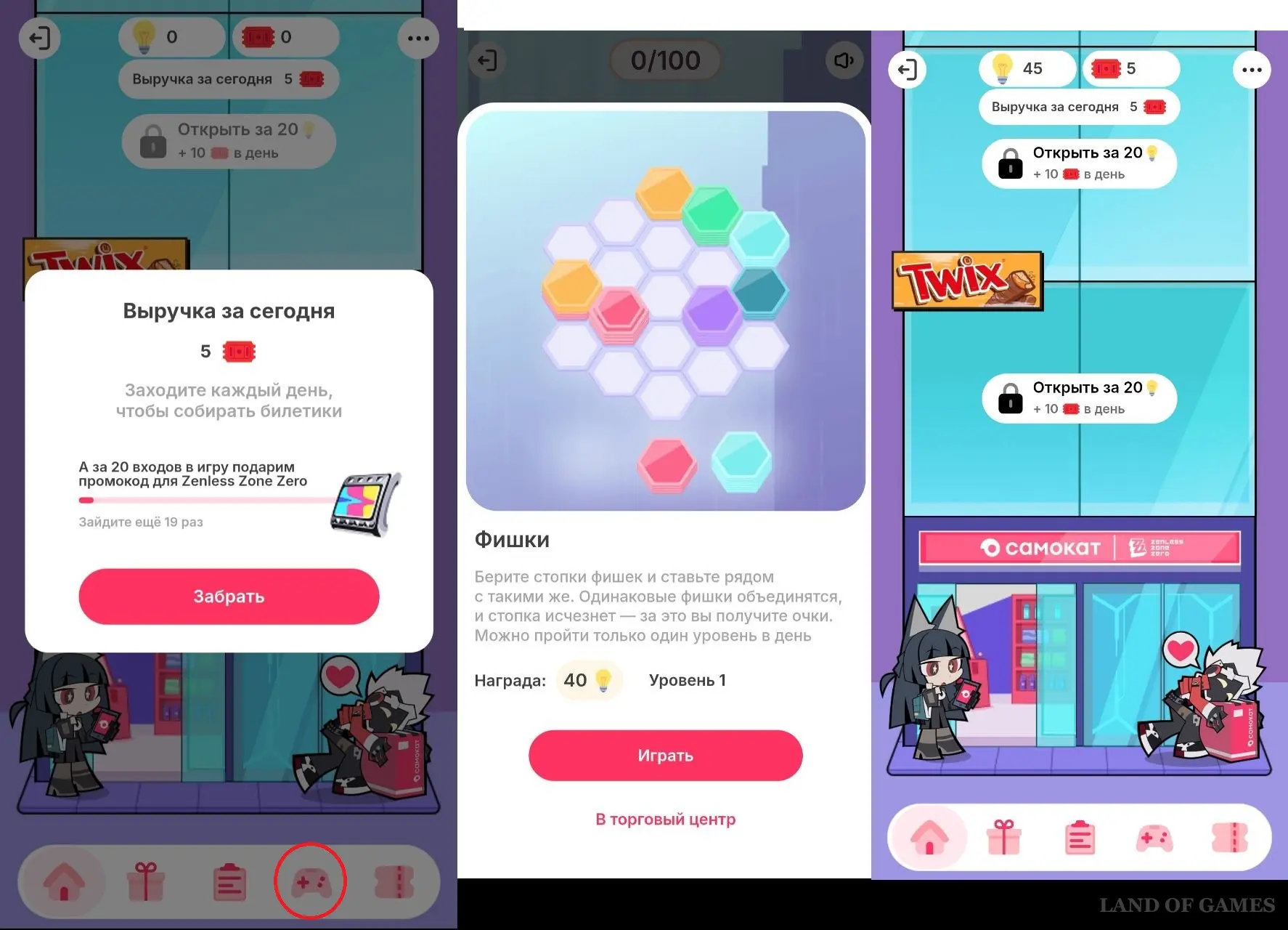 Это мини-игра в приложении Самокат. Заходя каждый день, вы получаете определенную выручку — от 5 билетиков. Чтобы повысить доход, проходите уровни в игре «Фишки», зарабатывайте энергию и тратьте ее на улучшение торгового центра.