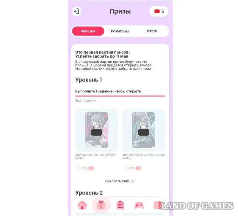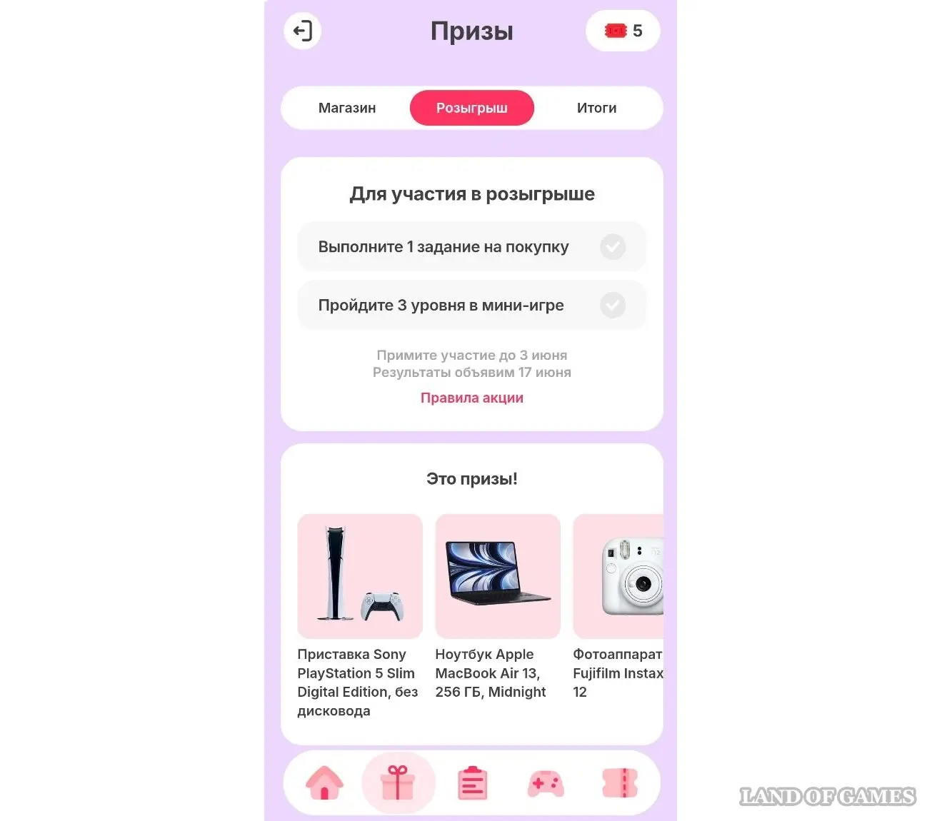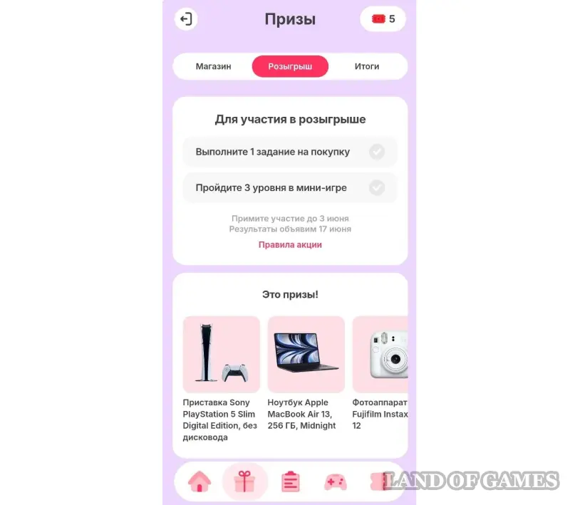 Выполнив 1 задание на покупку и пройдя 3 уровня в мини-игре, вы станете участником розыгрыша. Принять участие в нем можно до 3 июня. Результаты будут объявлены 17 июня, срок выдачи призов — до 31 августа.