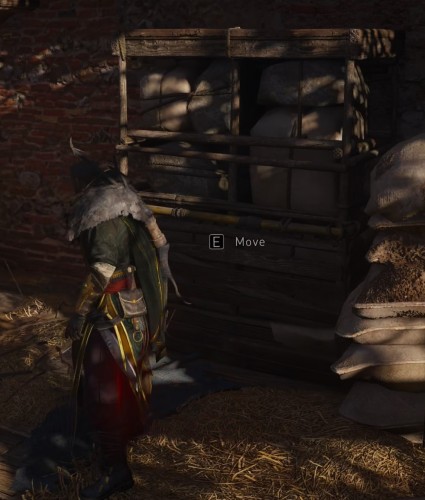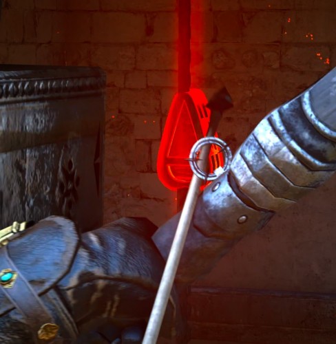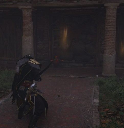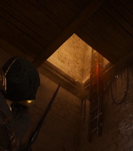 Теперь посмотри наверх – вы заметите сложенную деревянную лестницу. Выстрелите в нее, чтобы она упала, и вы смогли подняться на верхний этаж, где находится сундук с броней.