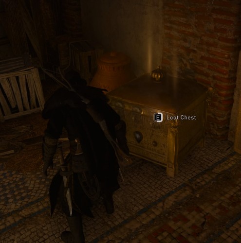 Разрушьте замок и отнесите взрываемую вазу к стене здания, которая покрыта трещинами. Теперь запустите в нее стрелу, чтобы создать себе новый проход. Войдите внутрь и осмотрите сундук.