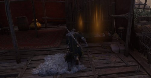 Найдите ключ, лежащий на столике снаружи, и войдите в деревянную постройку. Разбейте дверь, чтобы добраться до 2-х сундуков. Плащ лежит в том, который закрыт на замок.
