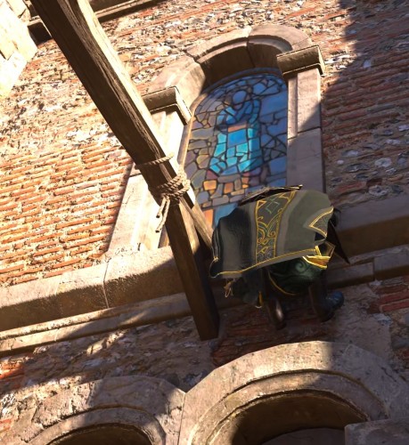 Возьмите ключ, открывающий дверь церкви. Его можно найти на скамейке во дворе религиозного сооружения. Вы можете использовать гуляющих монахов в качестве прикрытия, так как они ходят по необходимому вам маршруту – к ключику, а потом к двери. Откройте дверцу и войдите внутрь.