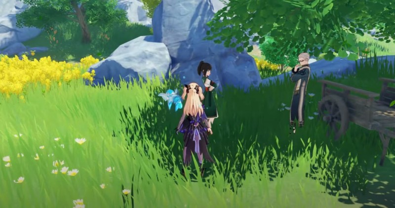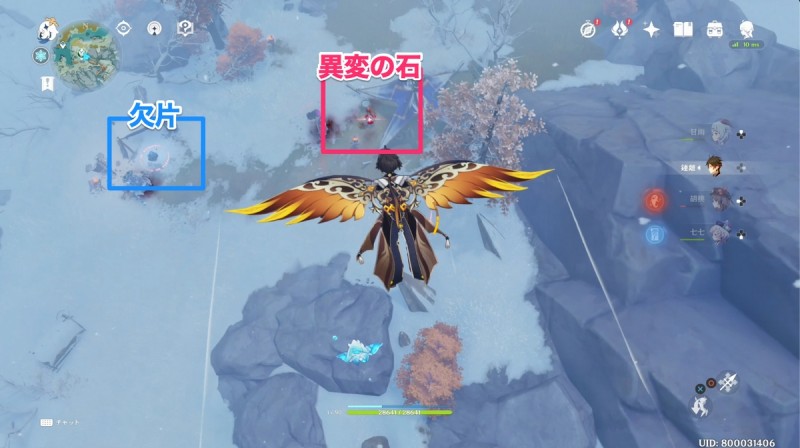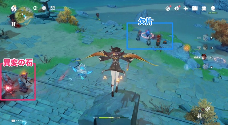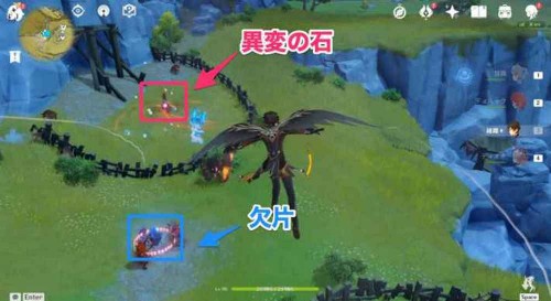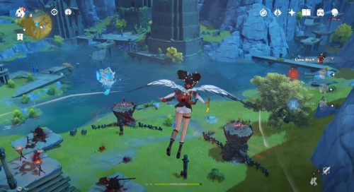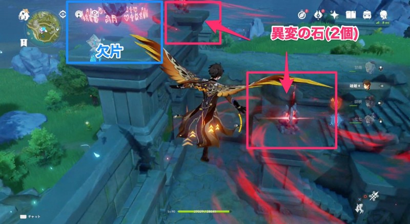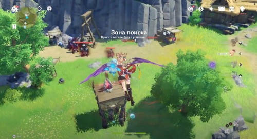 Переместитесь к статуе семи неподалеку от деревни Миньюнь, а затем спланируйте вниз прямо на башню с камнем мутации. Разрушьте его, а уже потом уничтожьте булыжник, расположенный внизу, рядом с врагами. Когда с камнями будет покончено, разберитесь первым делом с Пиро мушкетерами, а затем атакуйте Электро молотобойцев.