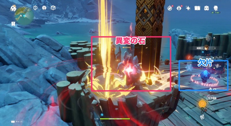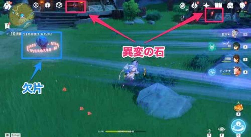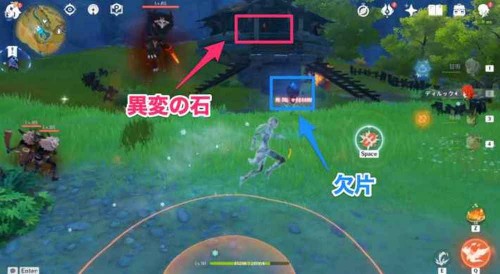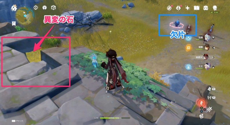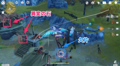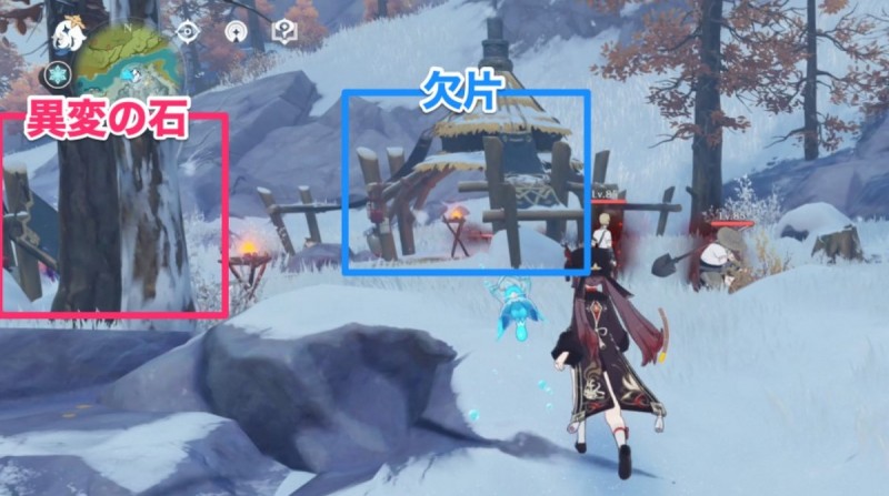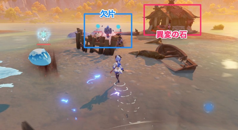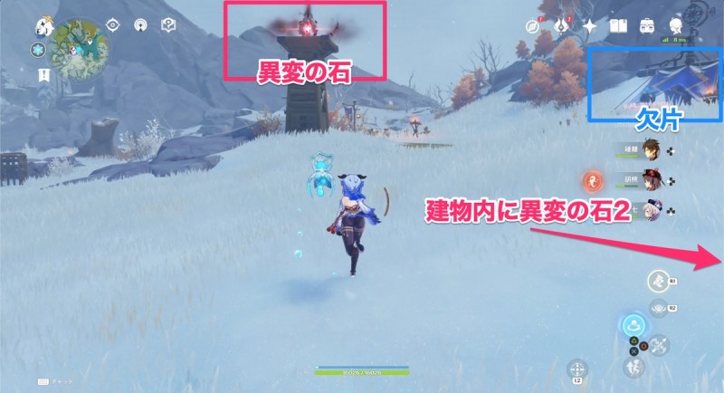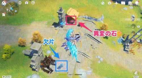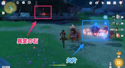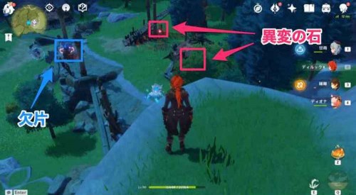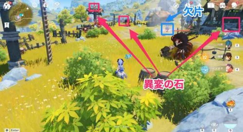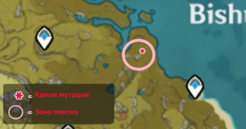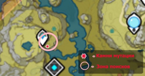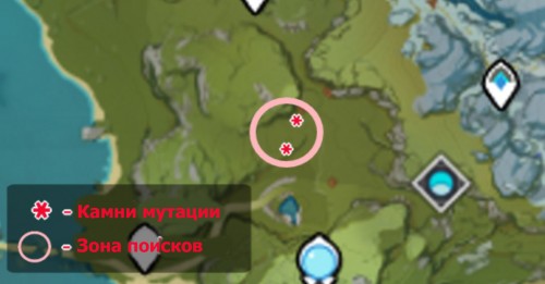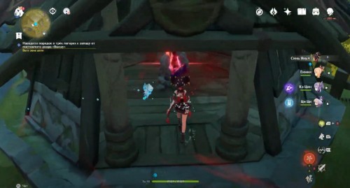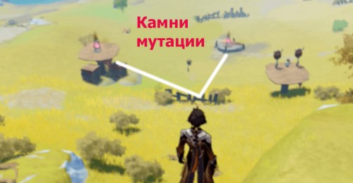 На скриншотах ниже демонстрируется вторая область для зачистки. Тут будут сразу 2 камня мутации, спрятанные в в хижинах хиличурлов. При должной сноровке вы сможете проникнуть в зданя, не побеспокоив находящихся неподалеку монстров. Уничтожьте камни, а потом разберитесь с врагами.