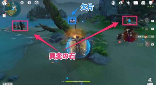 Добравшись до нужного места, вы столкнетесь с группой монстров. Вам не удастся собрать фрагменты, пока не убьете чудищ. Этих врагов будут значительно усиливать находящиеся неподалеку камни мутации (1-3 штуки), так что первым делом следует уничтожить эти булыжники.
