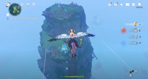 Теперь просто спланируйте на следующую возвышенность справа или слева. Снова перебейте всех противников. Не забудьте открыть сундучок на вершине. Далее доберитесь до последней горы, используя веревочные мосты. Кстати, осмотрите клетку на деревянной платформе хиличурлов, так как в ней спрятана раковина эха.