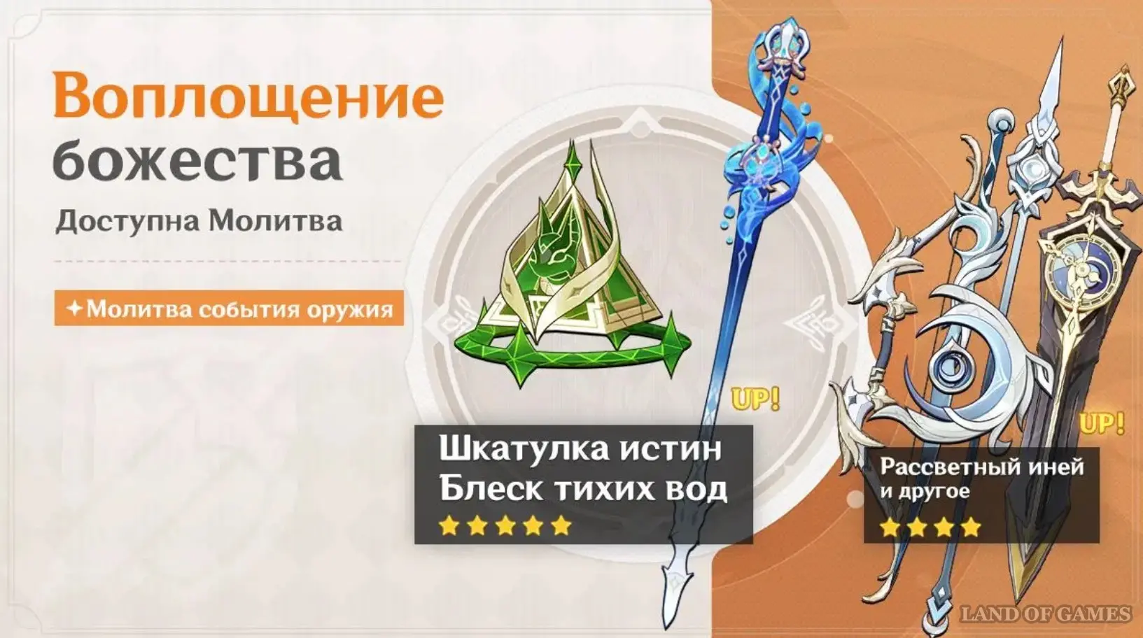 - Временные (молитвы события персонажа и оружия) – регулярно меняются с выходом нового обновления, началом какого-нибудь крупного ивента или появлением уникального героя. Как правило, дают возможность гарантировано получить эксклюзивного 5-звездочного бойца. Для осуществления круток в них требуются «Переплетающиеся судьбы», продающиеся за 160 камней истока.