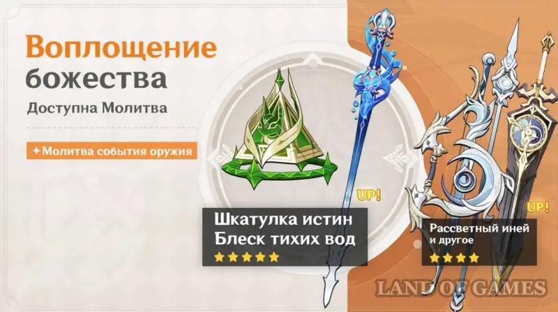 - 5-звездочное оружие: Шкатулка истин (Катализатор) и Блеск тихих вод (Одноручное)