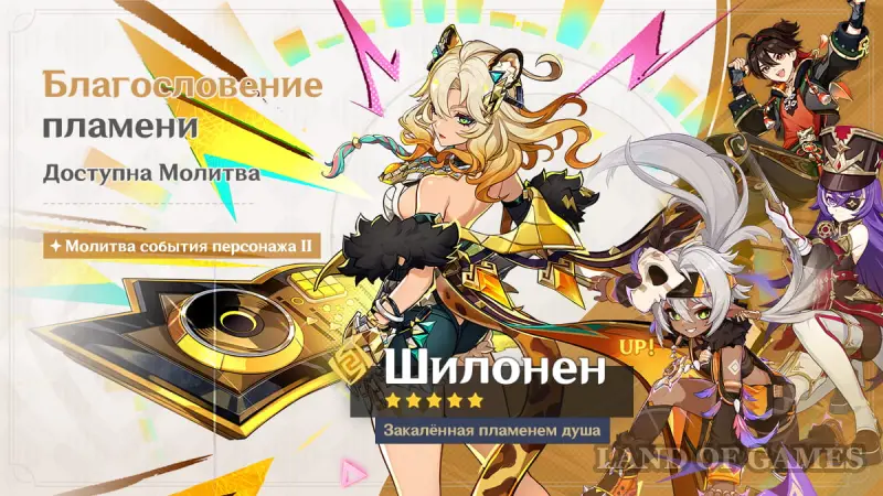 В рамках него повышена вероятность выпадения Шилонен, которая относится к Гео стихии и использует в бою одноручный меч. Благодаря своим уникальным способностям она может играть роль саппорта в отряде, давая значительные усиления к стихийному урону у персонажей разных элементов.