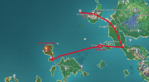 Разумеется, первым делом вам нужно будет попасть на саму Инадзуму. После выполнения задания «Побег с острова Рито» вы можете сразу же направиться в деревню Конда, а затем оттуда пойти на остров Амаканэ, вызвать там Волноход на якорной стоянке и поплыть прямиком на островок, расположенный к северо-западу от лагеря Кудзе. Именно тут и находится нужный вам противник (смотрите скриншоты ниже).