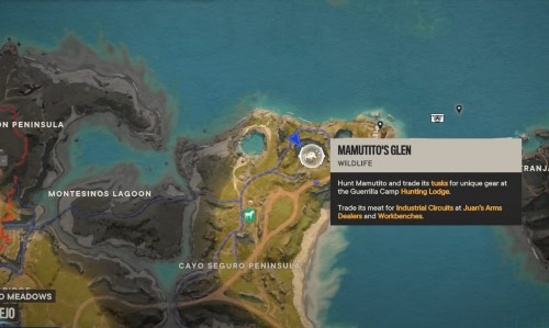 Его можно отыскать в северной части острова Сантуарио. Точное место показано на скриншотах ниже. Это не очень опасный зверь, однако, мы все же советуем вам взять пушку помощнее при решении убить его. С его тушки выпадают бивни Мамутито.