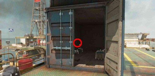 В результате вы откроете транспортный контейнер на верхнем уровне юго-восточной нефтяной площадки (расположена внизу и справа на карте). Там поднимитесь на крышу и пройдите позади синих контейнеров – один из них теперь будет открыт, и вы сможете забрать оружие, которое находится внутри него.