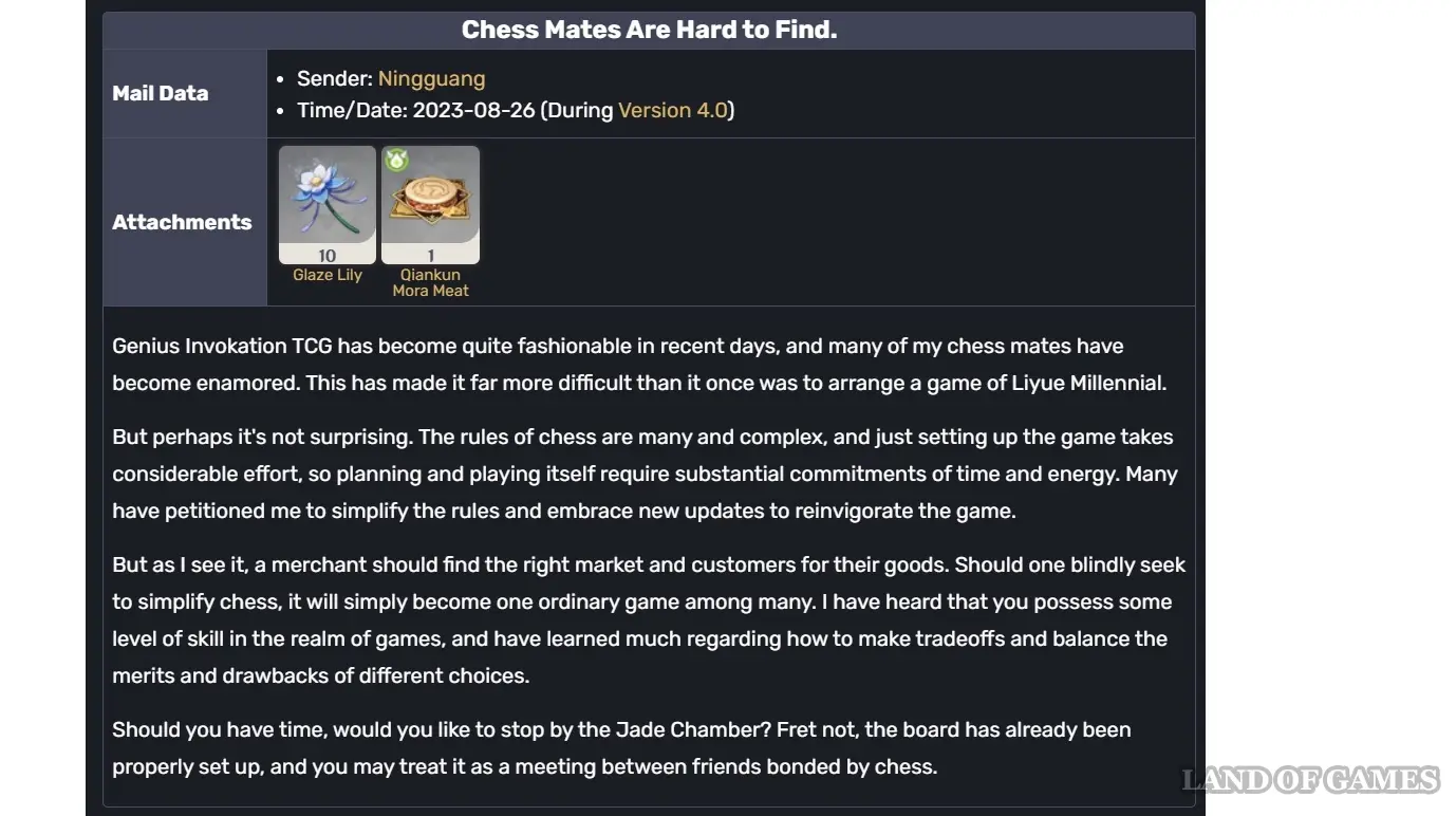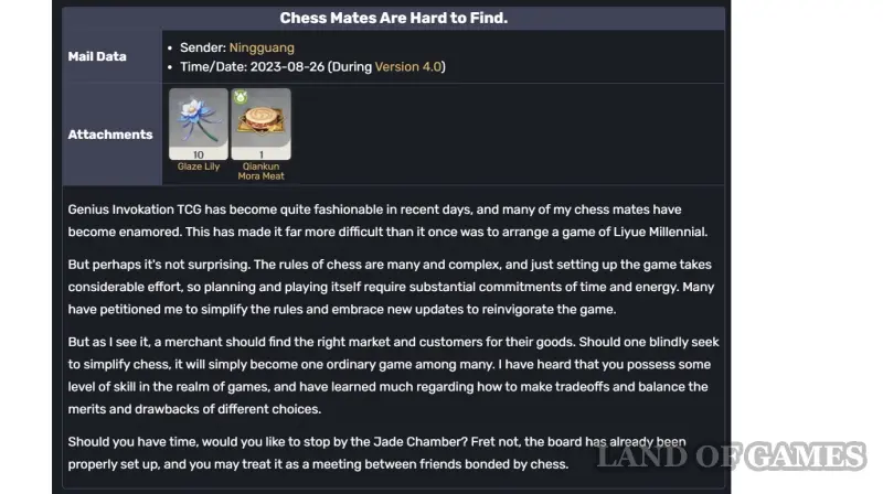 Некоторые герои из Ли Юэ могут прикладывать от 1 до 10 лилий к своим письмам на день рождения. Происходит это довольно редко: на данный момент только Гань Юй и Нин Гуан присылали подобные письма, и то всего 3 раза за все время существования игры. Полагаться на это как на способ фарма не стоит, но такие подарки помогают немного пополнить общий запас растений.