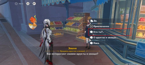 Подойдите к Эжени, продающей валяшки в Фонтейне. В разговоре с ней выберите отмеченные на картинках ниже варианты, чтобы один раз совершенно бесплатно получить четыре ягоды.