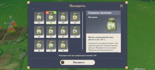 - Приобретите у Пухляша (можно купить 5 штук) или найдите семена сесилии (выпадают при сборе местной диковины). Ассортимент торговца обновляется 1 раз в неделю.
