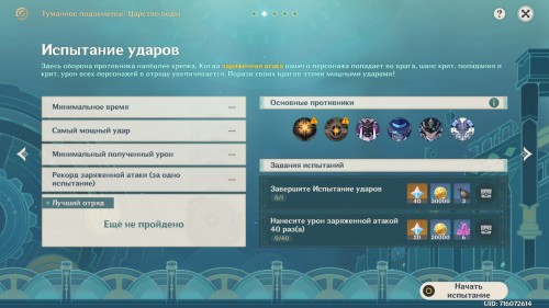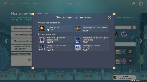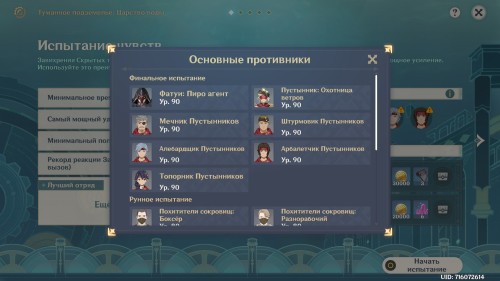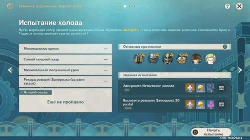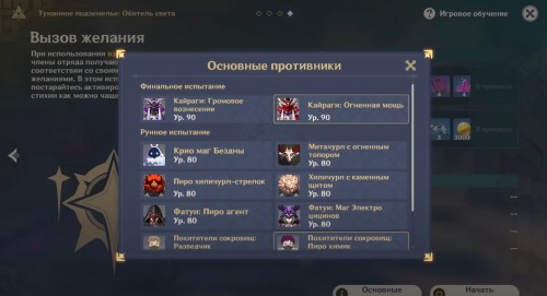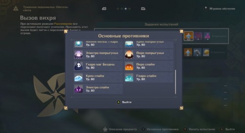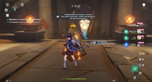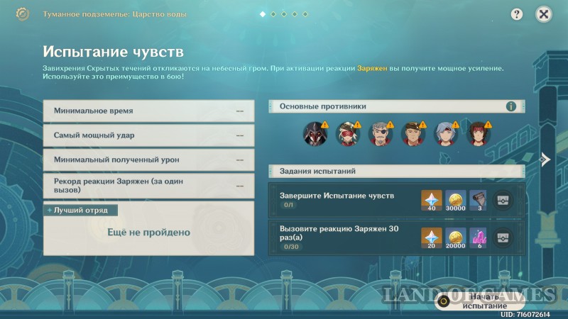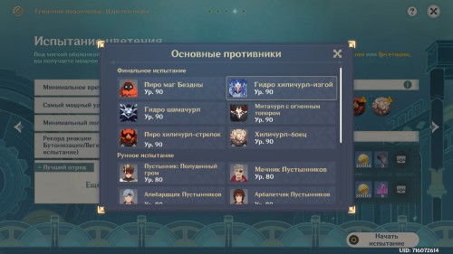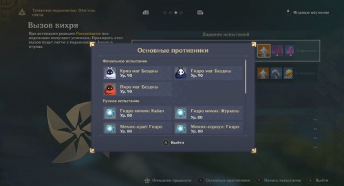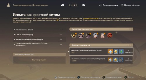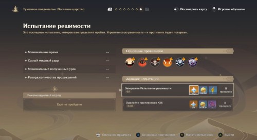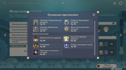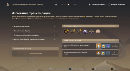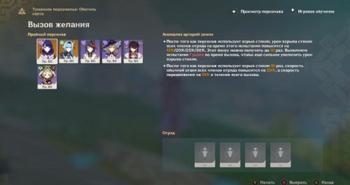 На скриншоте выше показаны пробные герои, которых вы сможете использовать в данном испытании. Учитывая аномалию артерий земли и второстепенную цель испытания, мы настоятельно рекомендуем взять Гидро и Пиро персонажей.