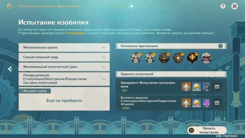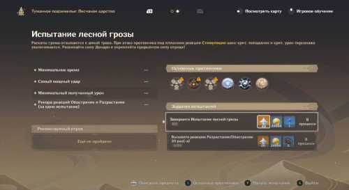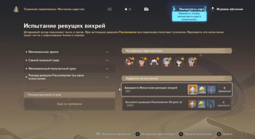 На скриншоте выше показаны пробные герои, которых вы сможете использовать в данном испытании. Учитывая аномалию артерий земли, мы настоятельно рекомендуем скомбинировать Электро и Дендро персонажей.