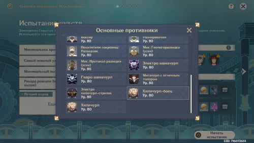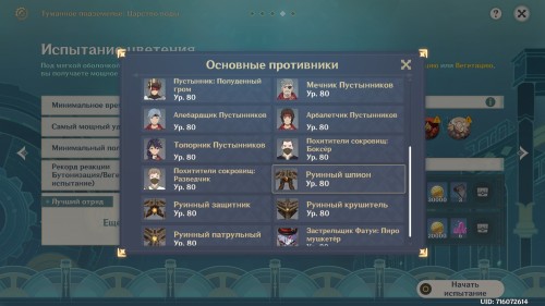 На скриншоте выше показаны пробные герои, которых вы сможете использовать в данном испытании. Учитывая аномалию артерий земли и второстепенную цель испытания, мы настоятельно рекомендуем взять Дендро персонажей, которых можно усилить Электро и/или Гидро бойцами.